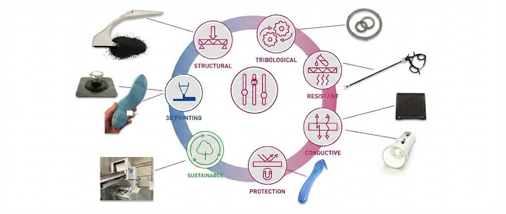 3D printing (LUVOCOM 3F & LUVOSINT): Modified thermoplastics in pellet form for 3D printing/FFF and powder form for 3D printing/laser sintering.