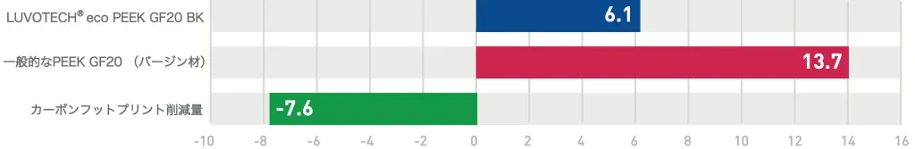 LUVOTECH® eco PEEKは一般的なバージンPEEKと比較して、-7.6 kg-CO2eqの温室効果ガス削減効果が期待されます。