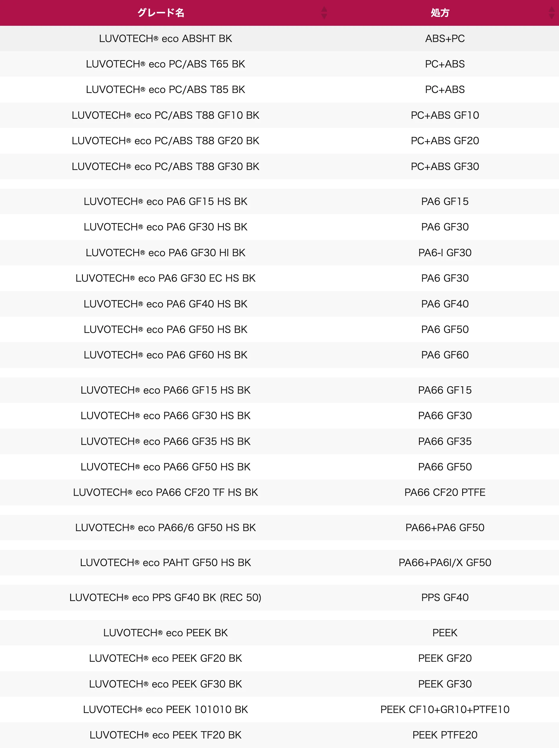LUVOTECH®ecoシリーズの標準グレードは以下の通りです。